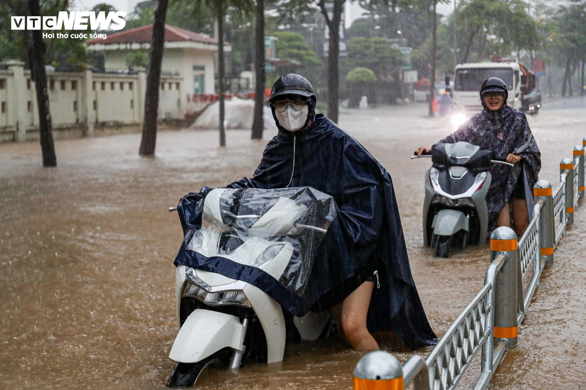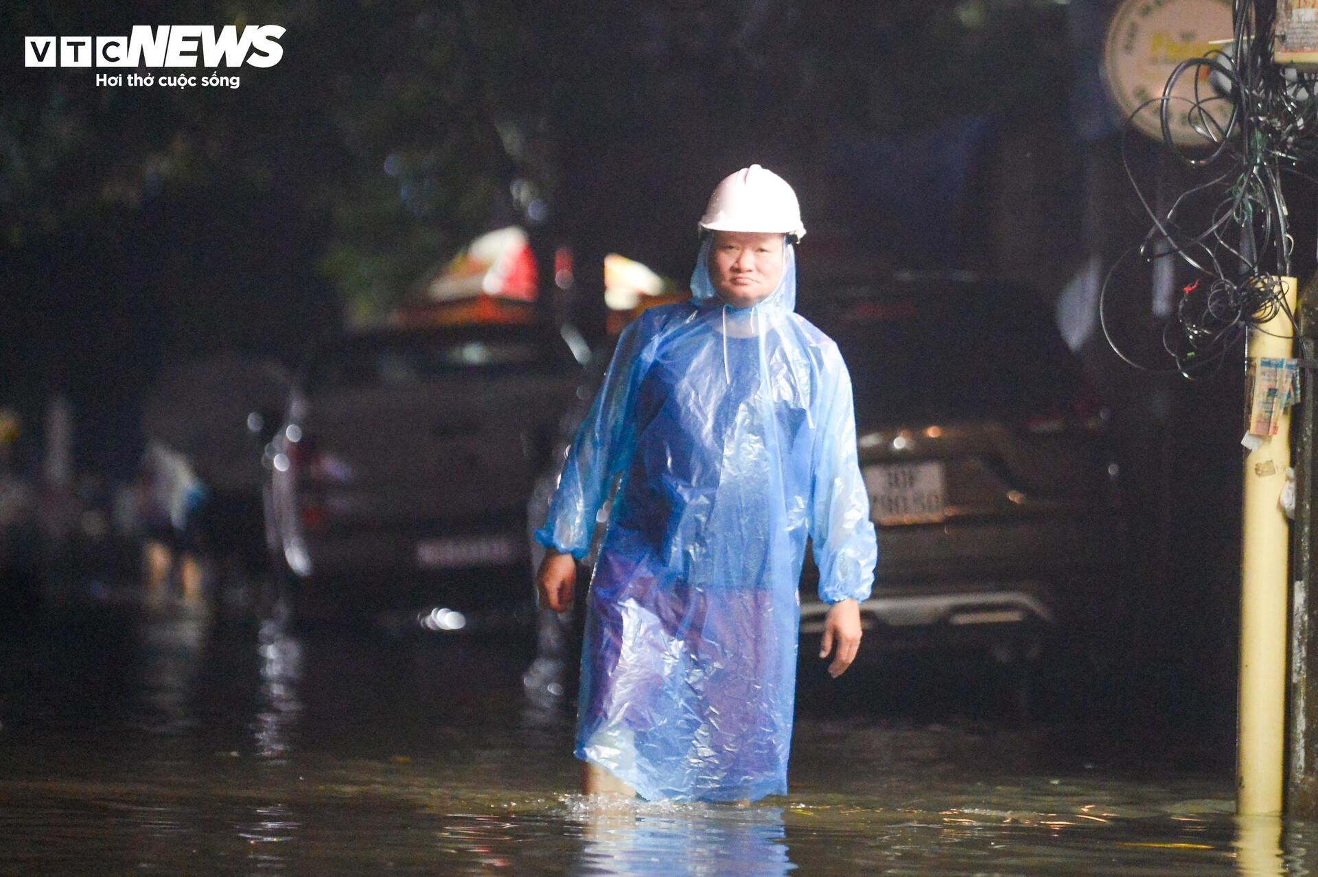 Cơn mưa xối xả trút xuống lúc 18h, nước thoát không kịp khiến cả tuyến phố Lương Thế Vinh (phường Thanh Xuân) nhanh chóng biến thành sông. Nước dâng quá nửa thân xe máy, khiến việc đi lại của người dân trở nên chật vật.