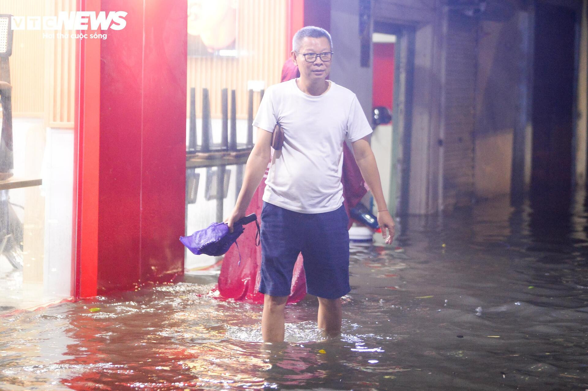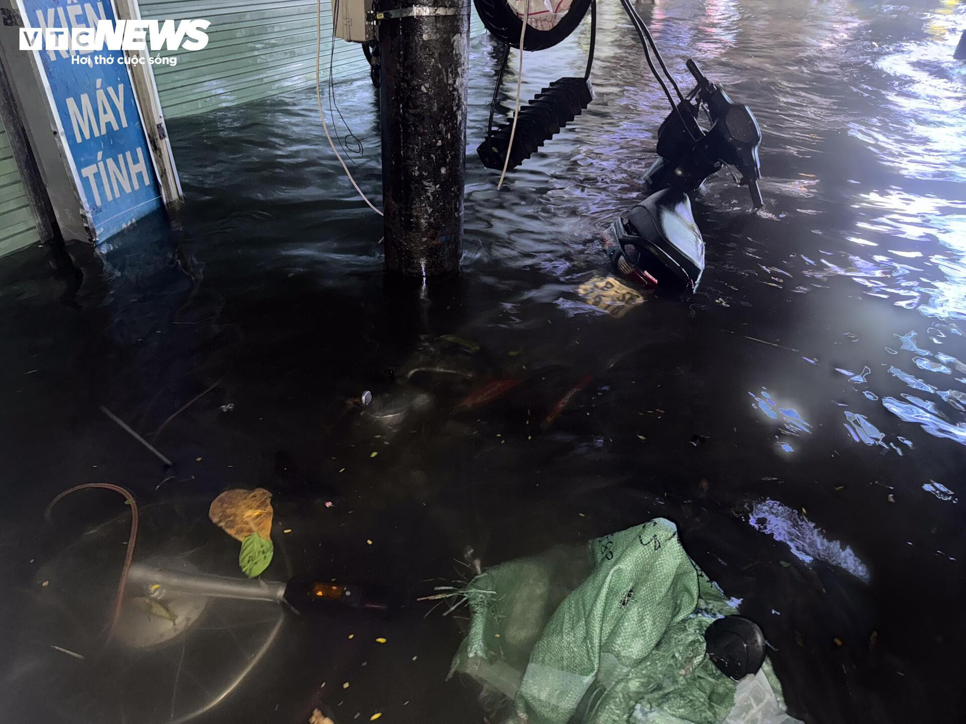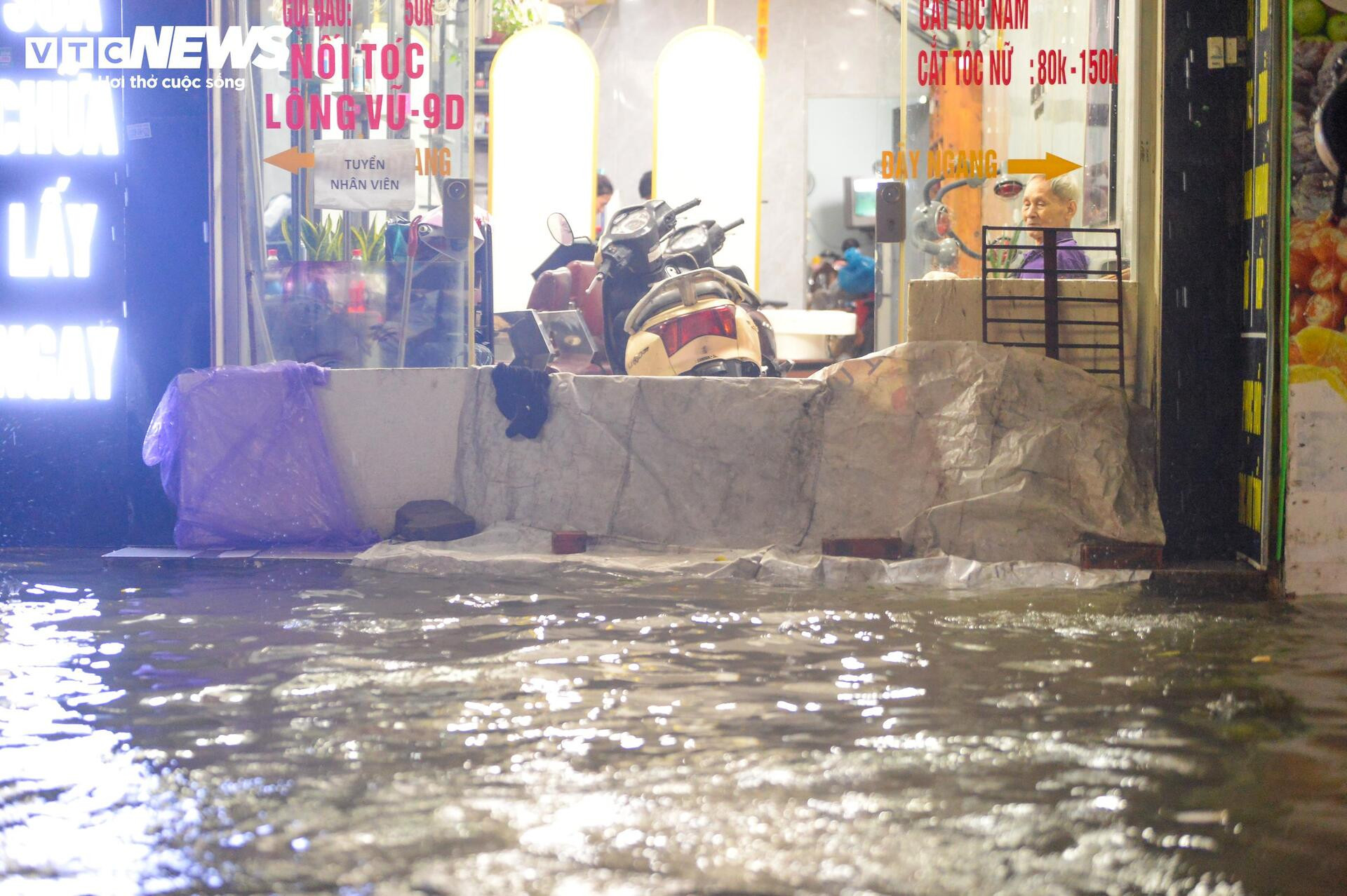 Nhiều hộ kinh doanh dọc tuyến phố cũng chịu thiệt hại. Nước dâng nhanh khiến hàng quán phải đóng cửa sớm, đồ đạc kê cao để tránh ướt. Một số gia đình tận dụng bao tải, tấm ván chặn nước nhưng vẫn không ngăn được dòng chảy ào ạt từ lòng đường tràn vào.