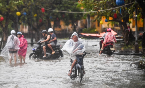 Sáng 28/9, các tuyến đường như Bạch Đằng, Nguyễn Thái Học (TP Hội An) ngập nước sâu khoảng một mét. Thời tiết vẫn còn mưa nhiều kèm gió lớn.