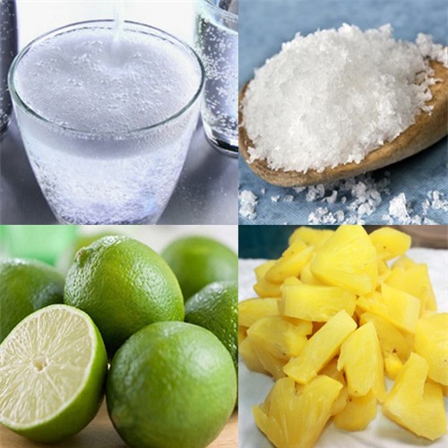 - Lấy khoảng 250ml nước soda, thêm vào nước ép dứa và cốt chanh đã chuẩn bị. Cuối cùng đổ 1 thìa cafe muối vào khuấy đều tay cho muối tan hết.