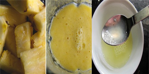 - Dứa các bạn bỏ sạch tai, lõi đem xay nhuyễn rồi lọc lấy 20ml nước ép.