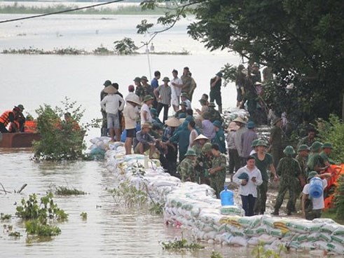Từ đêm 29, rạng sáng 30/7, hàng trăm người dân cùng bộ đội được huy động để ngăn nước tràn đê sông Bùi...