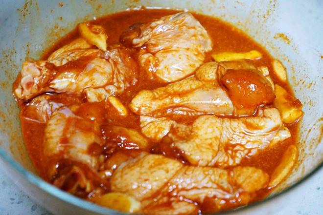Dùng tay bóp thật kỹ cho gia vị thấm đều vào thịt gà. Sau đó bọc tô cánh gà lại, để trong ngăn mát tủ lạnh 2 tiếng. Nếu có thời gian bạn hãy ướp qua đêm trong tủ lạnh.