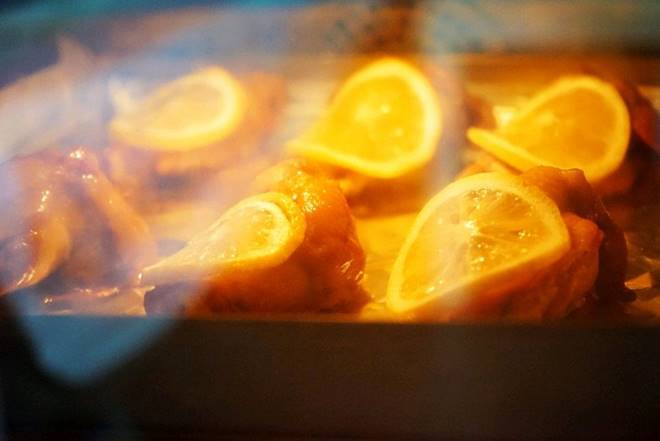 Tiếp theo, đặt một lát chanh lên cánh gà. Khi nướng thịt ở nhiệt độ cao, một lượng nhỏ vị chua của chanh sẽ bay hơi nên bạn không lo gà bị chua nhé.