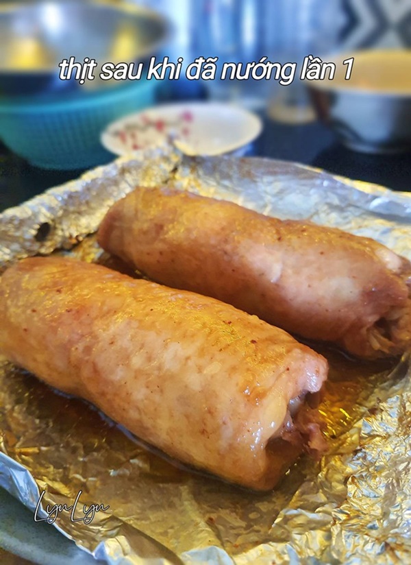 - Xong lần 2, trở mặt cuốn gà, nướng thêm lần 3 : 180 độ/2 phút là xong.