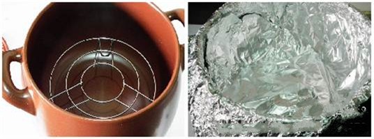 Để rack vào trong nồi đất, tiếp đó cắt giấy nhôm bọc phía bên trên đến thành nồi.