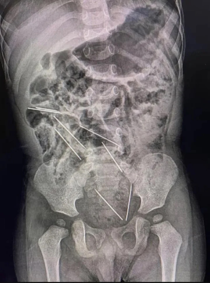 Kết quả chụp X-quang cho thấy, trong bụng cậu bé có 8 chiếc kim tiêm. Có 2 chiếc kim trong khoang bụng bên phải, 3 chiếc ở phía khoang bụng bên trái, 1 chiếc ở thành bụng và 2 chiếc khác nằm ở vị trí nguy hiểm giữa bàng quang và trực tràng.