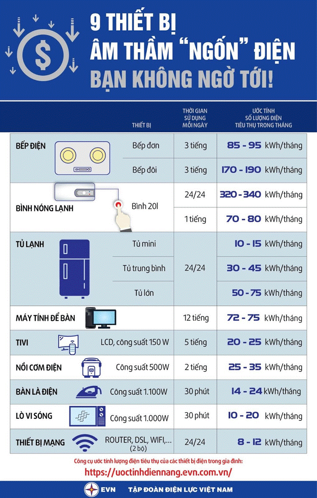 Tuy nhiên, dù sử dụng chỉ khoảng vài giờ trong ngày, nhưng bình nóng lạnh luôn được đánh giá là một trong những thiết bị tiêu thụ nhiều điện nhất. Đánh giá của Tập Đoàn điện lực Việt Nam (EVN) cho thấy, một chiếc bình nóng lạnh có dung tích 20 lít khi bật 1 giờ/ngày, có thể tiêu tốn từ 70 - 80 KWh/tháng. Con số này nhiều hơn cả 1 chiếc tủ lạnh hoạt động 24/24, hay một chiếc máy tính để bàn hoạt động 12 giờ/ngày.