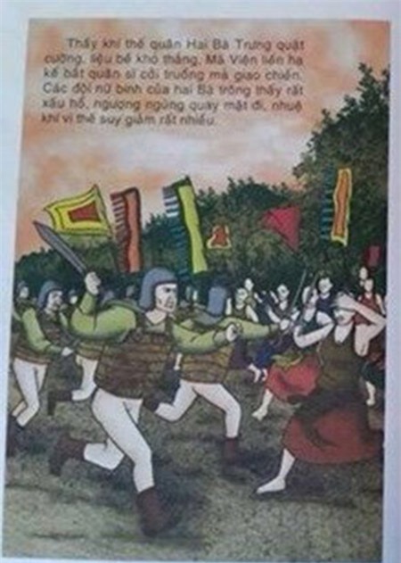 Trong cuốn "Trưng nữ vương khởi nghĩa Mê Linh" được đưa lên mạng xã hội, bên cạnh hình vẽ quân lính của Mã Viện không mặc quần, sách còn viết: "Thấy khí thế quân Hai Bà Trưng quật cường, liệu bề khó thắng, Mã Viện liền hạ lệnh bắt quân sĩ cởi truồng mà giao chiến. Các đội nữ binh của hai Bà trông thấy rất xấu hổ, ngượng ngùng quay mặt đi, nhuệ khí vì thế suy giảm rất nhiều.