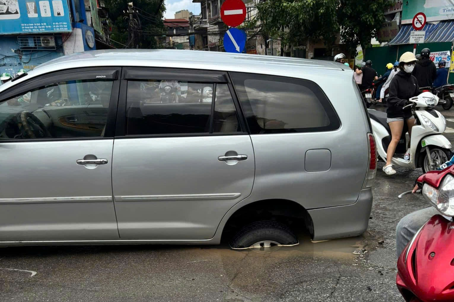 Ngày 28/8, một sự cố hy hữu xảy ra trên phố Đội Cấn (phường Ngọc Hà, Hà Nội) khi một ô tô đang lưu thông bất ngờ bị tụt bánh xuống hố sâu.