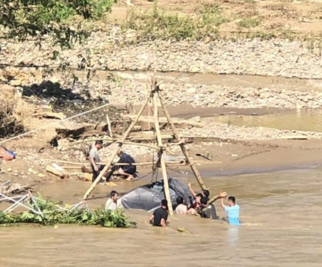 Do cách quá xa đường nên hiện mọi người đang kết bè nổi bằng lốp xe rồi kéo dọc sông đến đoạn gần đường thì dùng cẩu để cầu lên đưa đi sửa.