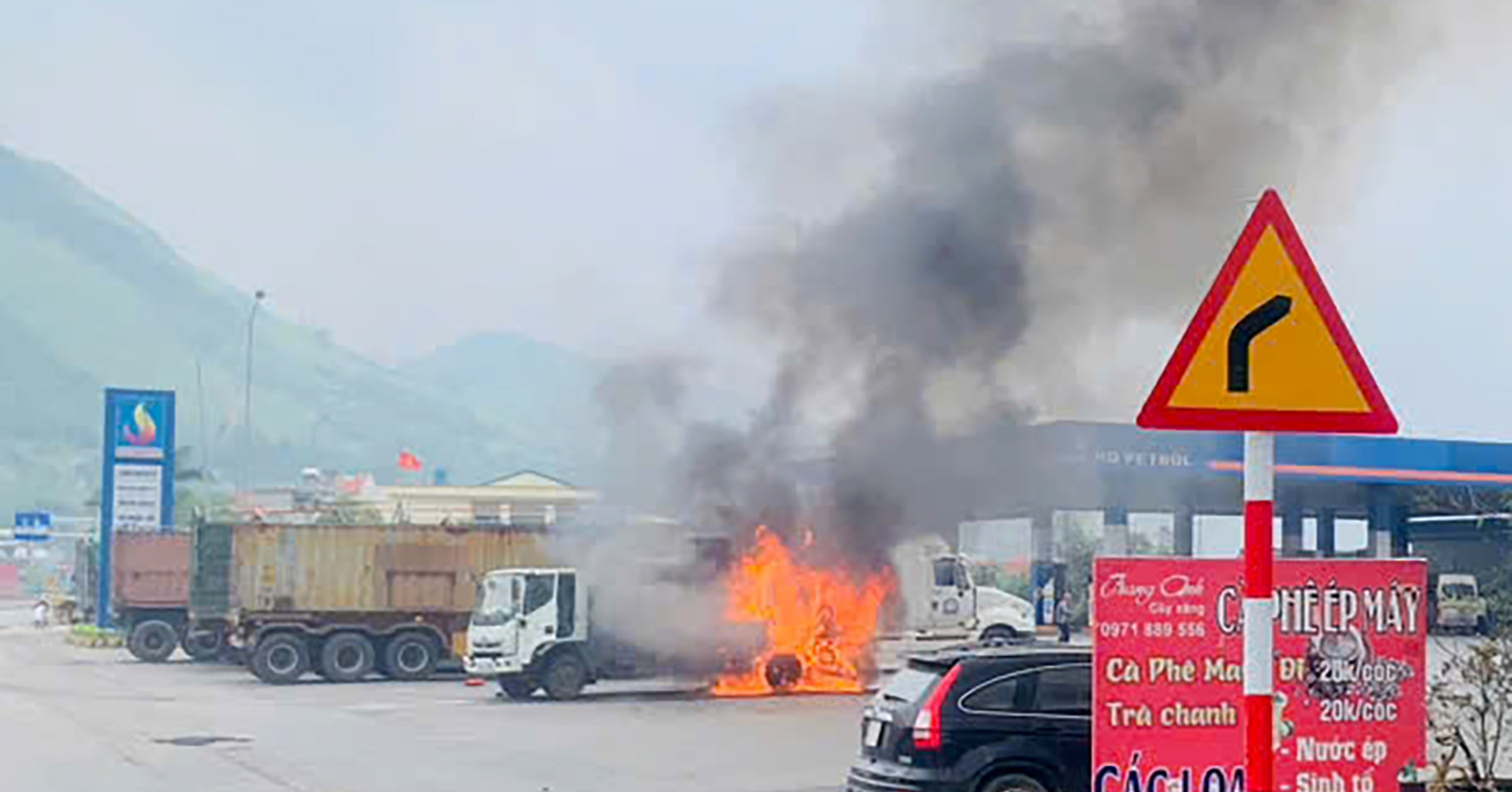 Ngọn lửa xuất phát từ phần đầu xe rồi nhanh chóng bao trùm thân xe. Khói đen cuồn cuộn bốc cao hàng chục mét.
