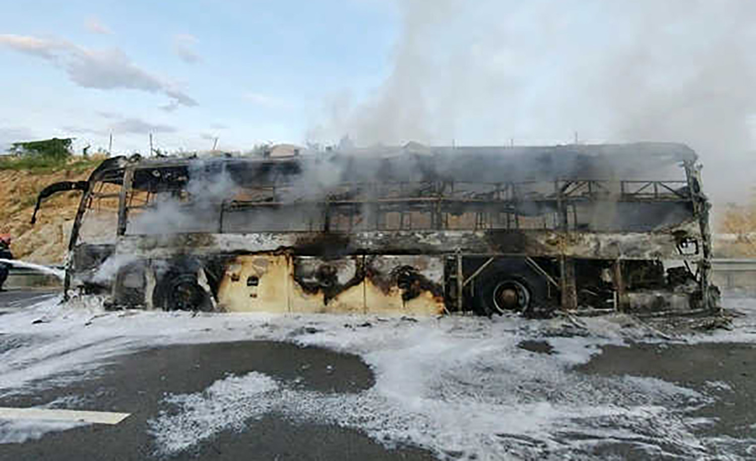 Khi đến đoạn qua địa phận xã Nam Cam Ranh (tỉnh Khánh Hoà), cabin xe bất ngờ bốc khói. Nam tài xế nhanh chóng di chuyển vào làn khẩn cấp, hô hoán toàn bộ hành khách kịp thời thoát ra ngoài. Xe khách sau đó bốc cháy trơ khung.