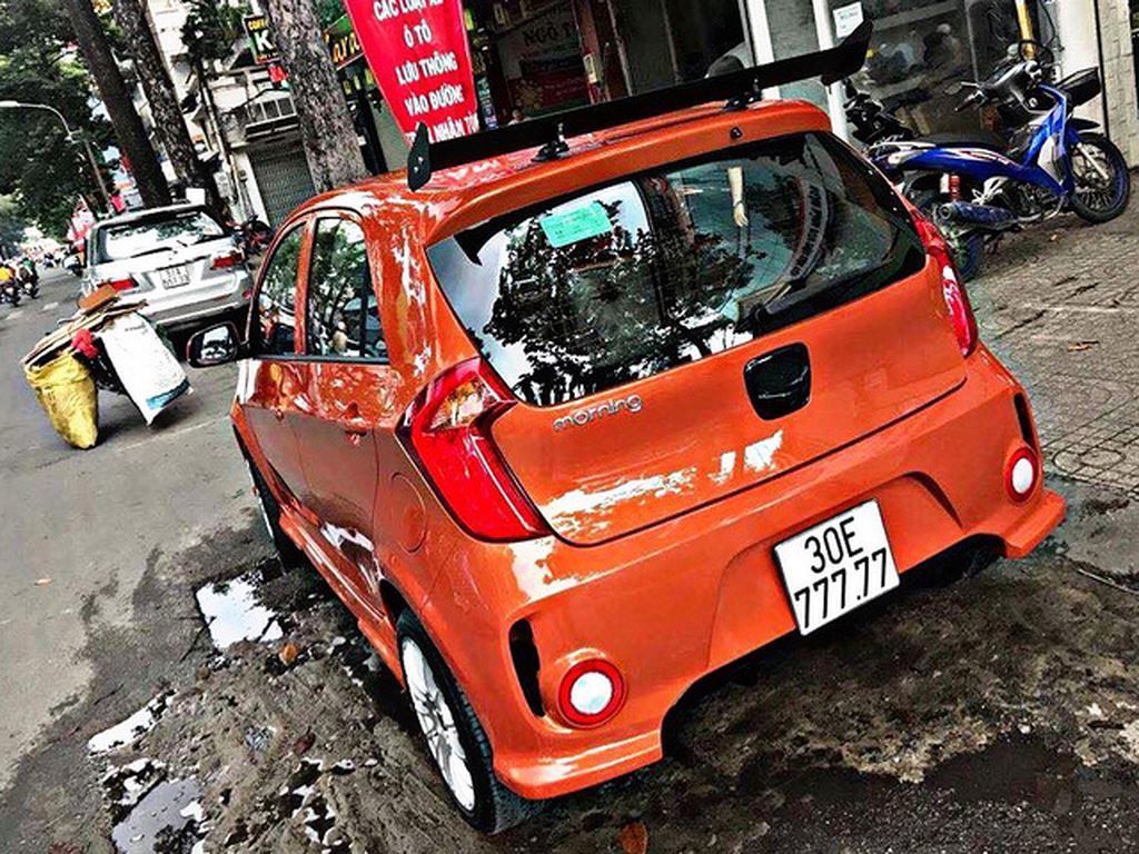 Một chiếc xe Kia Morning mang biển "ngũ 7" 30E 777.77. Để xứng với biển số đẹp trên, chủ xe đã đưa chiếc Kia Morning đi làm đẹp lại nội thất và cả bên ngoài. Xe được đổi sang màu cam và làm lại đèn, mặt ca-lăng giống bản cao cấp Si.