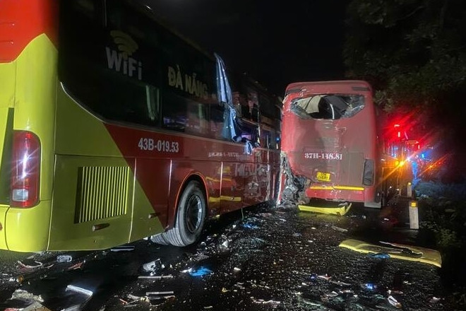 Sau đó xe khách này tiếp tục đâm trực diện xe bán tải đang di chuyển theo hướng ngược lại.