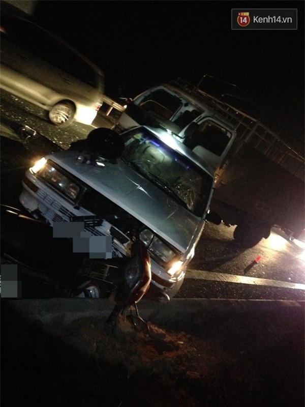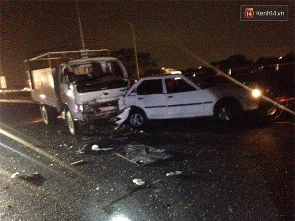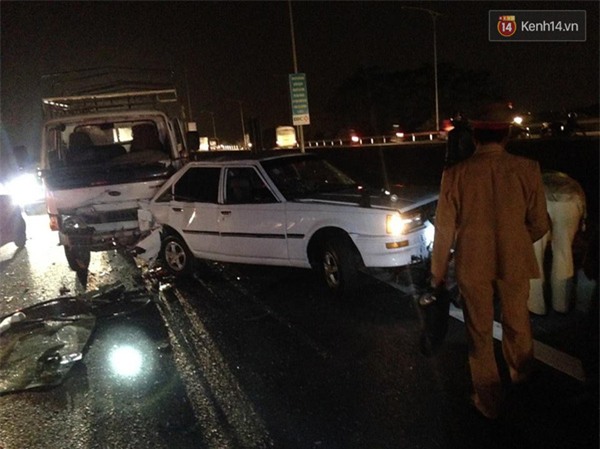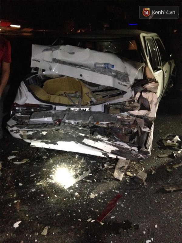 hiện trường, mảnh vỡ ô tô tải vương vãi khắp nơi, chiếc xe ô tô con bị