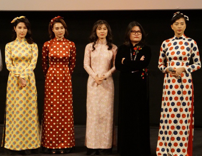 Kay Nguyễn (áo dài đen) là biên kịch đồng đạo diễn bộ phim điện ảnh ăn khách Cô Ba Sài Gòn do "đả nữ" Ngô Thanh Vân sản xuất.
