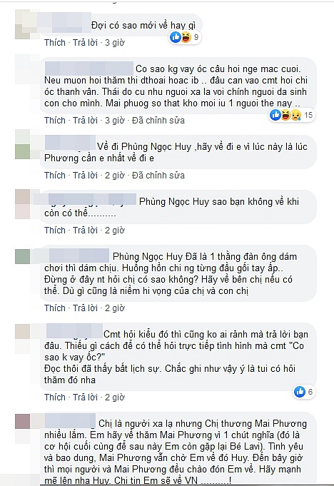 “Huy có nhắn tin riêng với Ốc. Bạn ấy muốn về cũng không thể về được đâu các bạn ạ. Kẹt giấy tờ, nước Mỹ xa xôi quá. Thôi, chuyện này ai cũng khổ. Thương nhất là con gái Lavie, đứa trẻ cần có cha mẹ hoặc ít nhất có một trong hai. Cả nhà cầu nguyện cho Mai Phương nhé”, Ốc Thanh Vân giãi bày.