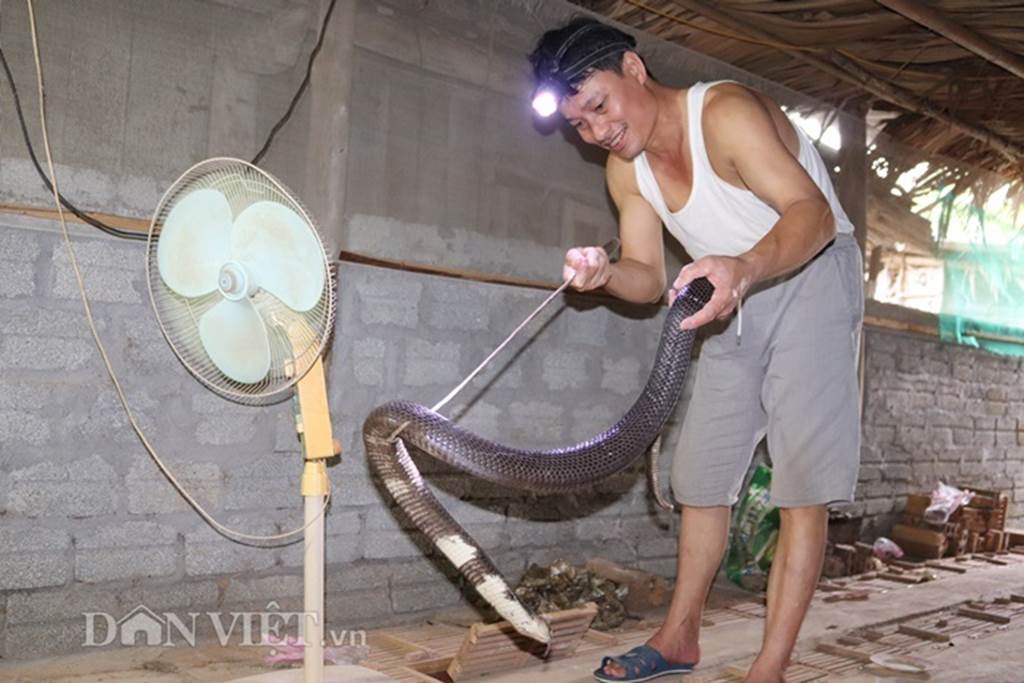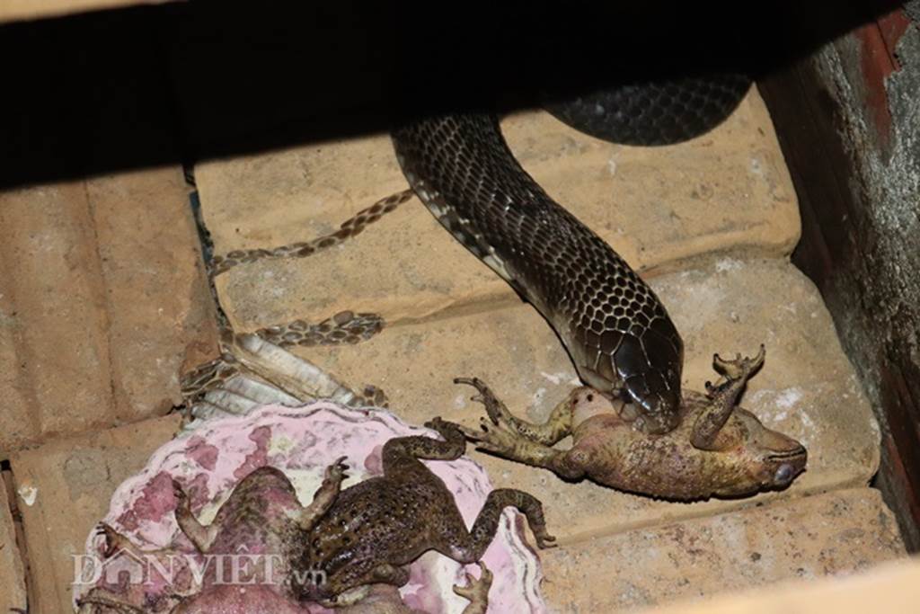 Cũng theo ông Bình, rắn hổ mang 4 – 5 ngày mới ăn một lần, mùa đông rắn ngủ đông ròng rã suốt 5 tháng nên rất nhàn. Thức ăn của rắn hổ là cóc, gà, vịt, ngan. Nhưng nếu có điều kiện cho ăn cóc vẫn là tốt nhất, vì cơ thể cóc có nhiều chất đạm, nhiều kháng sinh. Rắn hổ ăn cóc sẽ được thương lái ưa chuộng và giá bán cao hơn so với ăn gà, vịt, ngan.