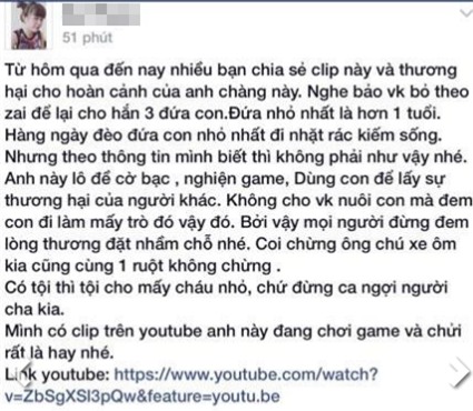 Tuy nhiên nhiều người cho rằng không nên soi mói quá nhiều về anh chàng này nữa vì ai cũng có quá khứ: “Không giúp được gì cho ngta thì thôi, các người soi mói vừa thôi. Cùng là 1 kiếp người, ai chả có quá khứ cơ chứ. Đừng lên án người khác khi mình chưa hiểu hết được câu chuyện. Trước mắt cứ nhìn 3 đứa trẻ thơ đã nhé! Anh ấy không đi ăn cắp ăn trộm, không làm gì hại ai? Chỉ làm việc kiếm tiền nuôi con, thì hà cớ gì mọi người thay nhau soi mói, rồi chỉ trích này nọ.”, đó là ý kiến của bạn Quân.
