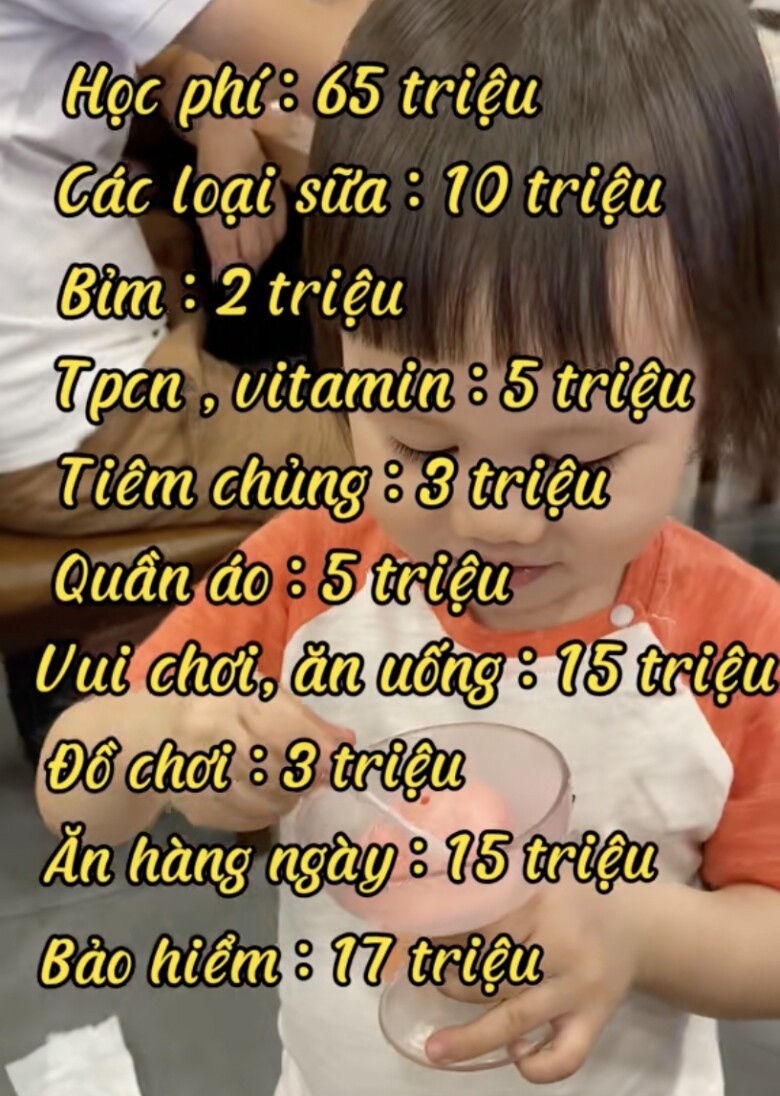 Tiền đi học 65 triệu/tháng/7 bé; Các loại sữa: 10 triệu; Bỉm: 2 triệu; Thực phẩm chức năng, vitamin: 5 triệu; Tiêm chủng: 3 triệu; Quần áo: 5 triệu; Vui chơi, ăn uống cuối tuần: 15 triệu; Đồ chơi: 3 triệu; Ăn hàng ngày: 15 triệu; Bảo hiểm kèm thẻ y tế: 17 triệu. Ngoài ra, còn chưa kể cái khoản phí thuê giúp việc, điện nước sinh hoạt gia đình, chi tiêu riêng của bố và các khoản phát sinh khác mà mình không thể liệt kê hết”.