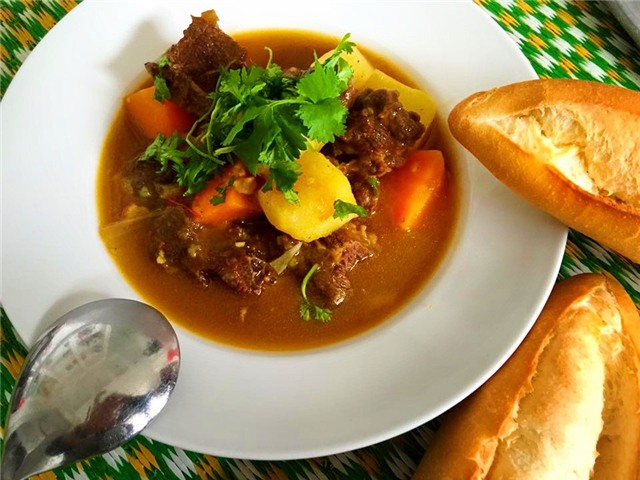 - Cà rốt, khoai tây thái như thịt bò, tranh thủ nhặt rau mùi lúc rảnh. - Cà chua cho vào chảo, bỏ ít dầu vào, đảo đều để làm nước sốt, cho ít gia vị cho cà chua nhanh mềm. - Kiểm tra thịt bò nếu không còn màu đỏ nghĩa là đã ngấm, vớt ra cho vào chảo nóng già, săn mặt cái là đảo mặt, đều cái cho sốt cà chua vào đảo đều. - Cho nước dùng (hoặc nước sôi) vào ngập mặt thịt 1 chút, đun khoảng 1 tiếng, đậy vung, để lửa nhỏ. (Gạt bỏ hết hành, xả, gừng, hoa hồi trong nước ướp để lúc nấu không lấn át mùi, cho nước ướp vào cùng để hầm). - 30 phút sau cho khoai tây, cà rốt vào, lại đậy vung chờ khoai chín bở. Sau đó cho hành tây vào khoảng. - Pha khoảng 1 thìa canh bột năng (loại làm bánh bột lọc) vào 1 bát nước, cho vào khuấy đều cho nước sánh sánh là được. Múc ra bát, đĩa, cho mùi lên trên là thưởng thức.