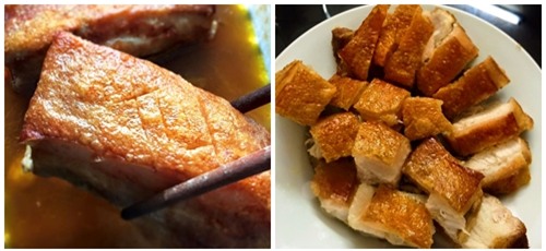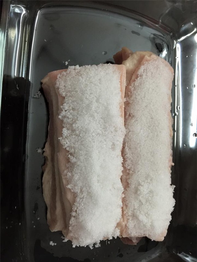 - Cho vào lò nướng, nhiệt độ 230 độ F khoảng 30 phút, đặt ở rãnh giữa, nướng lửa trên và lửa dưới. - Trong lúc chờ thịt thì làm phần nước cho vào thịt: ngũ vị hương, tỏi hành, tiêu, mắm... tuỳ sở thích. Cách làm này của người Anh nên họ chỉ cho nước đun sôi để ăn vị thịt nguyên chất. Nấu sôi tầm 1 lít nước. Thịt được mang ra hớt lớp muối đi, lúc này muối sẽ đóng lớp lại nên gỡ rất dễ, các mẹ nhớ bỏ sạch muối và rửa khay (chú ý khay nóng không cho nước lạnh sẽ vỡ khay), dùng dao sắc khía mặt bì để nổ đều. - Cho thịt vào khay, đổ nước đã làm bên trên vào ngập nửa miếng thịt, cho khay lên rãnh thứ 2 trên xuống, nhiệt độ 230 F, nướng 30 phút, nướng cả trên cả dưới. Sau đó, mang thịt ra, chặt hoặc cắt bằng kéo khỏi vỡ bì.