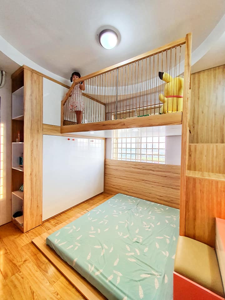 Anh Trung chia sẻ: "Bản thân làm trong ngành thiết kế cũng lâu nên mình luôn có trăn trở nhiều về không gian tiết kiệm diện tích nhưng khi vẽ cho khách hàng thì chưa có dịp làm kiểu gác lửng thay cho giường tầng đúng như ý tưởng nung nấu trong lòng. Cho đến khi nhà mình có thêm em bé và bà nội lên trông cháu thì mình mới quyết định làm thêm một không gian riêng cho bé lớn nhà mình.