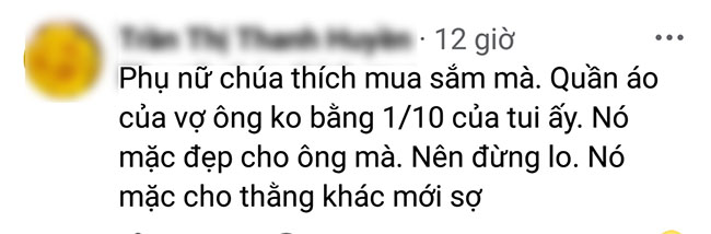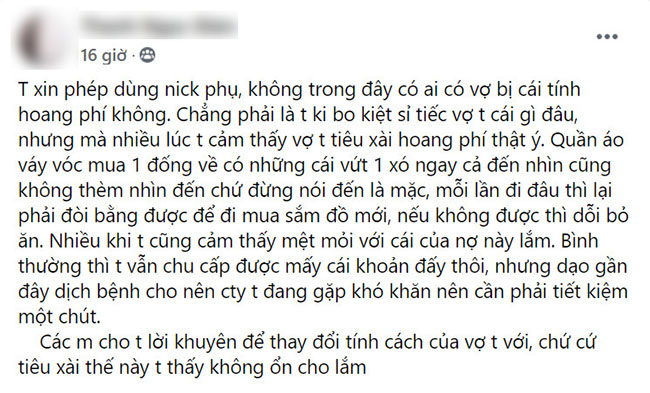 “Tôi xin phép dùng nick phụ, không trong đây có ai có vợ bị cái tính hoang phí không. Chẳng phải là tôi ki bo kệt sỉ tiếc vợ tôi cái gì đâu, nhưng mà nhiều lúc tôi cảm thấy vợ tôi tiêu xài hoang phí thật ý. Quần áo váy vóc mua 1 đống về có những cái vứt 1 xó ngay cả đến nhìn cũng không thèm nhìn đến chứ đừng nói đến là mặc, mỗi lần đi đâu thì lại phải đòi bằng được để đi mua sắm đồ mới, nếu không được thì dỗi bỏ ăn. Nhiều khi tôi cũng cảm thấy mệt mỏi với cái của nợ này lắm. Bình thường thì tôi vẫn chu cấp được mấy cái khoản đấy thôi, nhưng dạo gần đây dịch bệnh cho nên cty tôi đang gặp khó khăn nên cần phải tiết kiệm một chút.