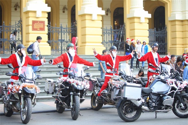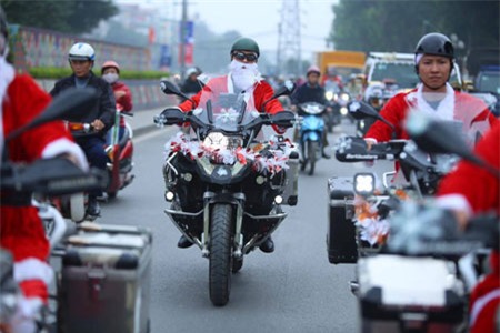 Đoàn xe được trang trí theo đúng phong cách Giáng sinh và những người ngồi trên xe mô tô đều ăn vận theo hình tượng Ông già Noel.
