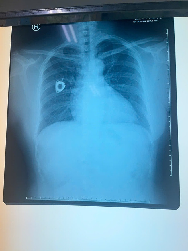 Mới đây, bệnh nhân đi khám tầm soát và chụp CT ngực tại một cơ sở y tế tư nhân thì phát hiện dị vật trong tim, nằm vắt ngang tại vị trí động mạch phổi hai bên. Sau đó, bệnh nhân quay về bệnh viện đã điều trị ung thư trực tràng để tiếp tục thăm khám và được tiến hành chụp X-quang ngực.