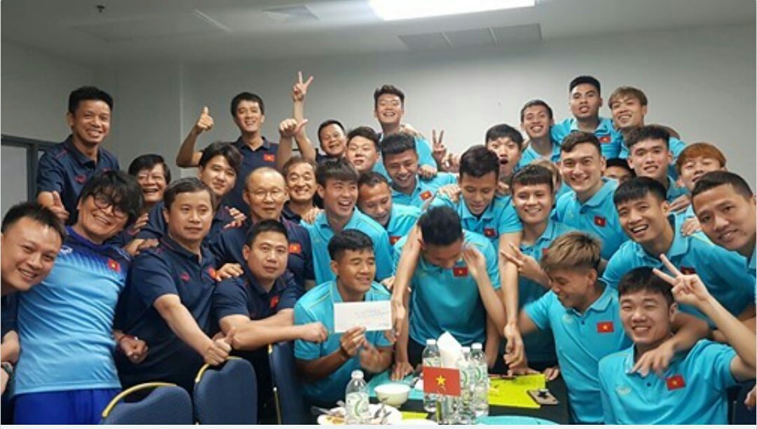 Toàn đội cùng nhau hát chúc mừng sinh nhật Hồng Duy cực sung. Thầy Park tiến đến ôm hôn Hồng Duy đầy tình cảm. Mọi người cùng nhau chụp một bức ảnh tập thể nhân ngày đặc biệt với cầu thủ quê Bình Phước. Ai cũng tươi tắn, rạng rỡ với nụ cười thoải mái trên môi. Bức ảnh lẽ ra đã có đủ 23 cầu thủ nếu như Văn Lâm không quá cao và vô tình che mất Văn Kiên và Văn Toàn không bị lọt thỏm giữa đám đông.