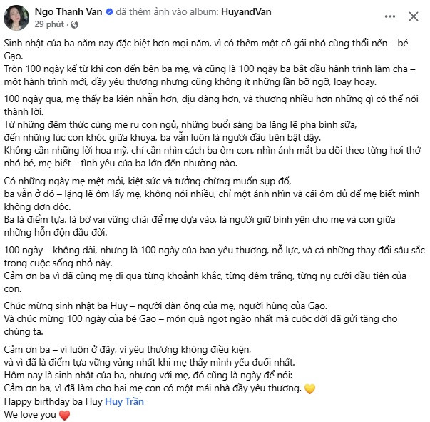 Nữ diễn viên gửi lời chúc mừng sinh nhật đặc biệt đến ông xã Huy Trần. Cô viết: "Sinh nhật của ba năm nay đặc biệt hơn mọi năm, vì có thêm một cô gái nhỏ cùng thổi nến – bé Gạo. Tròn 100 ngày kể từ khi con đến bên ba mẹ, và cũng là 100 ngày ba bắt đầu hành trình làm cha – một hành trình mới, đầy yêu thương nhưng cũng không ít những lần bỡ ngỡ, loay hoay.