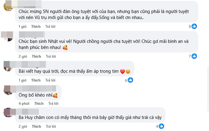 Bài đăng của nữa diễn viên lập tức thu hút hơn 15 ngìn lượt thích và hàng loạt bình luận. Bên dưới bài đăng, nhiều người gửi lời chúc mừng sinh nhật đến Huy Trần, khen anh chăm con khéo léo. Bên cạnh đó, một số người nhận thấy Huy Trần già đi thấy rõ sau vài tháng chăm con nhỏ.