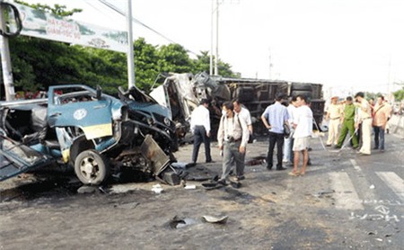 Cú đâm mạnh làm xe tải lật nhào, hàng nghìn chai thủy tinh vương vãi khắp đường. Ôtô khách bẹp dúm đầu, 6 người trên xe chết tại chỗ, trong đó có 2 em bé. 5 người khác bị thương nặng được đưa lên Bệnh viện Chợ Rẫy (TP HCM) trong tình trạng nguy kịch.