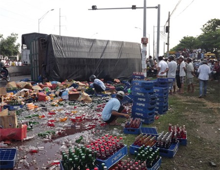 Xe tải chở nước ngọt lật nhào. Ảnh: Anh Hữu |