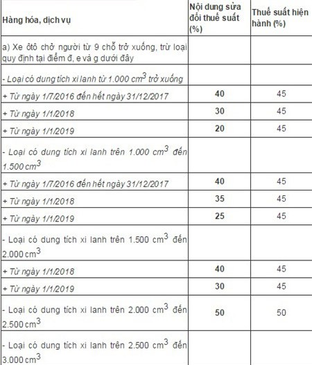 Với dòng xe có dung tích xi lanh từ 1.0-1.5L cũng sẽ áp mức 40%, giảm 5% so với hiện nay, đến 2018 giảm về 35% và tới 2019 giảm về 25%.