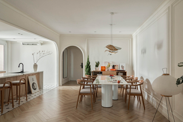 Nội thất trong nhà được làm bằng các chất liệu cao cấp như gỗ, đá, thủy tinh, kim loại, da... Không gian bếp được cải tạo từ phòng ngủ, thông với phòng khách, giúp không gian sinh hoạt chung trở nên rộng rãi, có tính kết nối hơn.