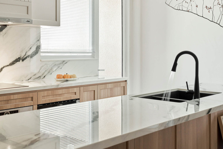 Phòng bếp đơn giản, hiện đại với các gia dụng được nhập khẩu từ Đức. Căn bếp thanh lịch, lãng mạn với gam màu trắng be nhẹ nhàng và chất liệu gỗ, đá ốp cao cấp.