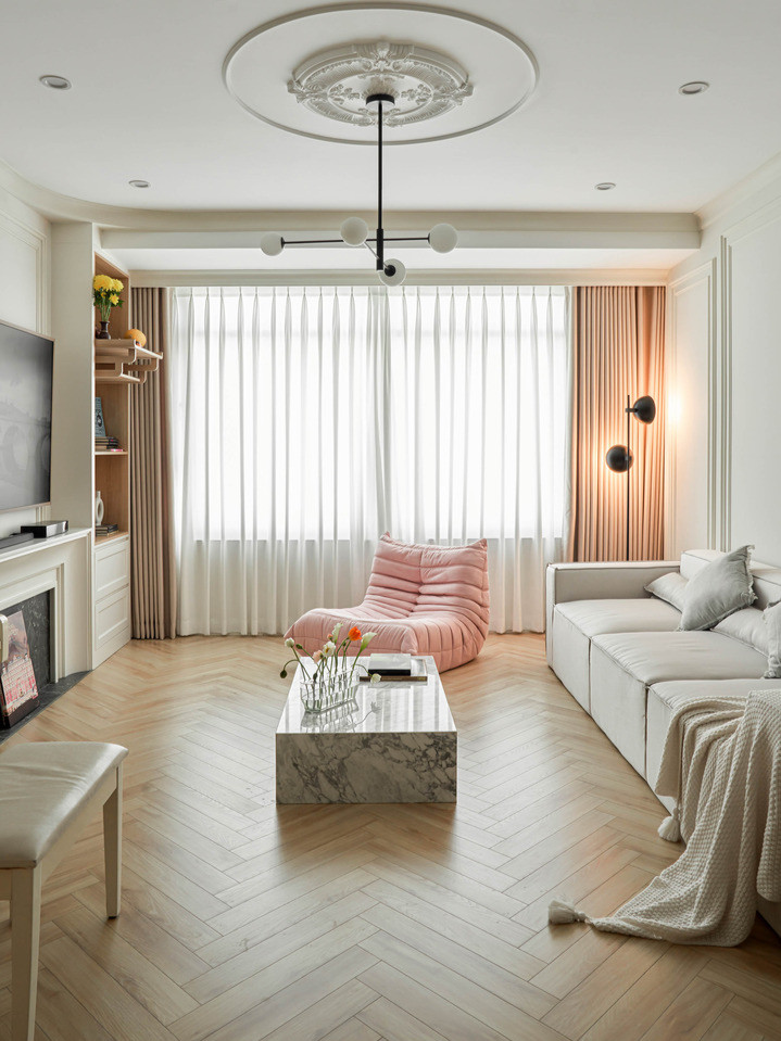 Phòng khách đón ánh sáng tự nhiên từ cửa sổ lớn, tạo cảm giác ấm cúng, thoải mái. Sofa được thiết kế riêng theo sở thích của nàng hậu.