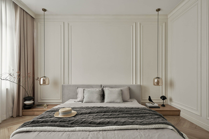 Phòng ngủ của vợ chồng Phương Anh tối giản, sang trọng với màu chủ đạo là trắng và xám.