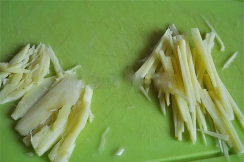- Gừng sau khi cạo sạch vỏ, rửa sạch, bạn hãy cắt thành những lát mỏng. Tuy nhiên, để có hiệu quả tốt nhất, bạn nên thái thành sợi, sau đó giã nhỏ để vị gừng đậm hơn và có công hiệu tốt nhất.