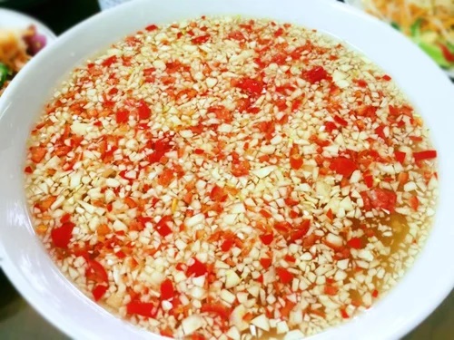 Để phần tỏi ớt nổi lên trên, bạn hãy pha nước chấm theo thứ tự sau: Cho nước lọc vào bát, thêm đường, bột ngọt trước, khuấy tan rồi mới thêm nước nắm, nước cốt chanh. Nêm nếm lại cho vừa khẩu vị. Cuối cùng là cho tỏi, ớt băm nhỏ.