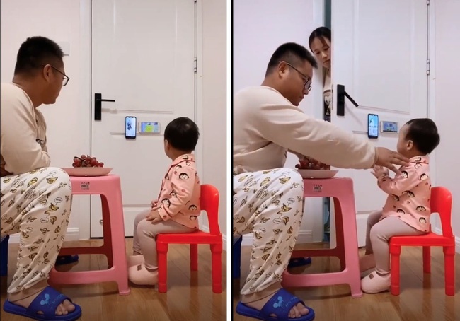 Ông bố quái chiêu đã lén dán 2 chiếc điện thoại lên cửa ra vào rồi cùng con gái xem chương trình hoạt hình yêu thích. Khi người mẹ bất ngờ đẩy cửa vào "thám thính", hai bố con liền giả vờ ngồi ăn nho.