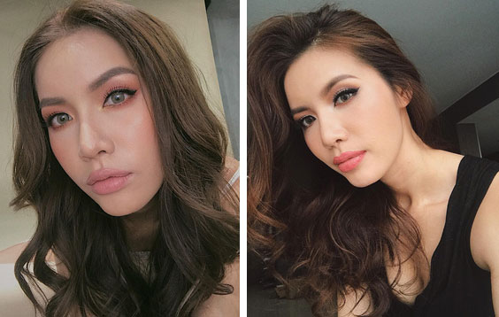 CÙng đánh son lỳ tiệp màu nhưng một bên nhẹ nhàng trong khi một bên lại cong dày một cách không hề tự nhiên chút nào.