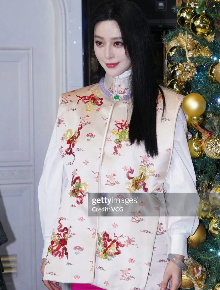 Phạm Băng Băng được mời dự tiệc tại tòa nhà của tỷ phú Triệu Thế Tăng. Nữ diễn xuất xuất hiện với trang phục mang phong cách sang trọng, sử dụng nhiều trang sức đá quý.