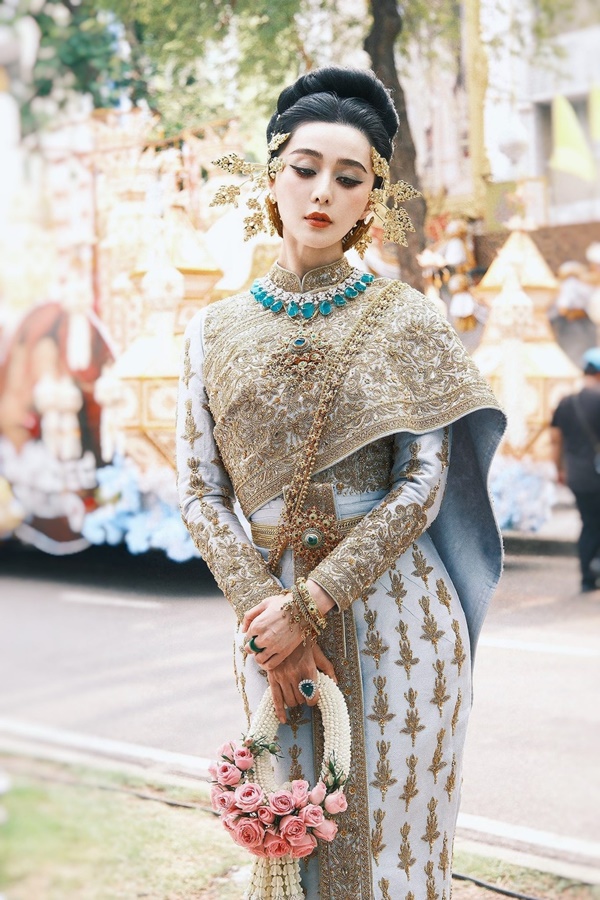 Xuất hiện với trang phục truyền thống Thái Lan và đeo nữ trang bằng vàng tinh xảo, nữ diễn viên Trung Quốc đi qua các con phố ở Bangkok và thu hút mọi ánh nhìn của hàng nghìn du khách cùng người dân địa phương.