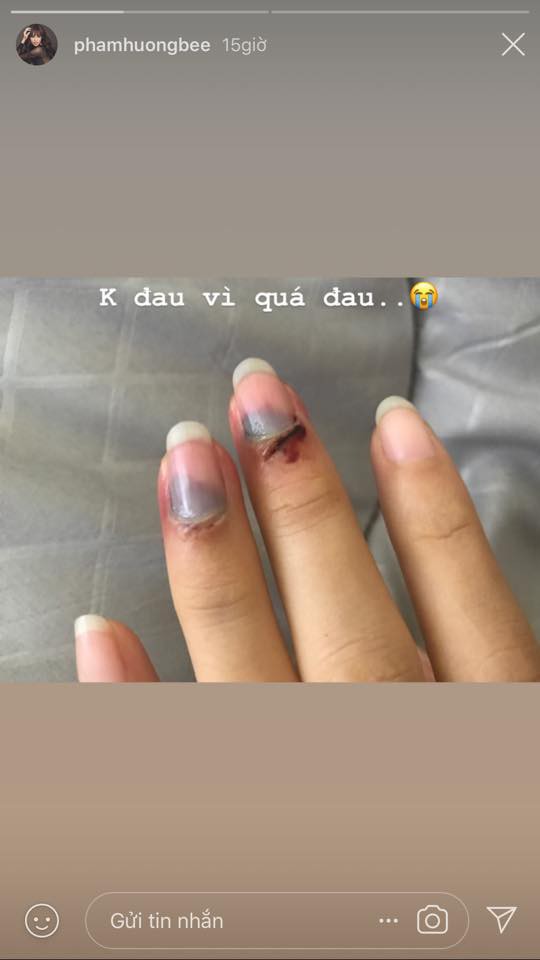 Theo bức ảnh này, hai ngón tay của Phạm Hương bị tụ máu, thâm đen có vẻ như bị kẹp hay vật nặng rơi vào. Cô cũng viết thêm "không đau vì quá đau" và icon khóc mếu.
