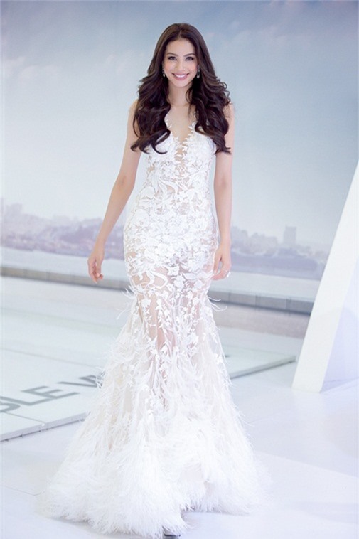 Tham dự chương trình, Hoa hậu Phạm Hương diện bộ váy gợi cảm màu trắng của NTK Lê Thanh Hòa. Những chi tiết lông mềm mại phần đuôi váy cộng với phần xuyên thấu gợi cảm đã tôn lên vẻ đẹp cũng như đường cong nóng bỏng của mỹ nhân gốc Hải Phòng.