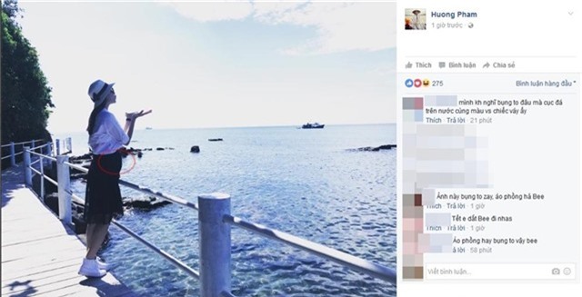 Nổi tiếng là Hoa hậu có nhan sắc xinh đẹp, ba vòng chuẩn đến từng centimet, vì vậy vóc dáng có điểm khác biệt của Phạm Hương đã nhanh chóng thu hút sự chú ý của mọi người. Có fans thắc mắc: áo phồng hay bụng to vậy Bee. Hay có bạn hỏi: ảnh này bụng to vậy, áo phồng hả Bee ơi….Không để Phạm Hương phải lên tiếng một cư dân mạng đã giải đáp thắc mắc giúp thần tượng: Mình không nghĩ bụng to đâu mà cục đá trên nước cùng màu với chiếc váy đấy.